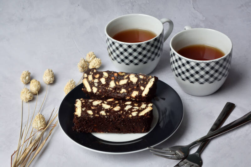 - Spatel de koekjes door het chocolademengsel en giet het vervolgens in een bakpapier bekleedde cakeblik. Doe er folio overheen en wacht minimaal 2 uur, het moet namelijk opstijven in de koelkast. Wij laten het altijd een nacht staan, just to be sure!